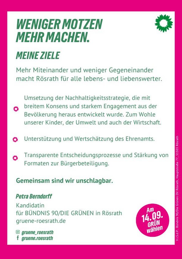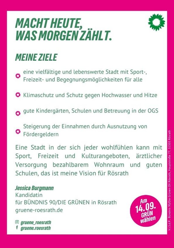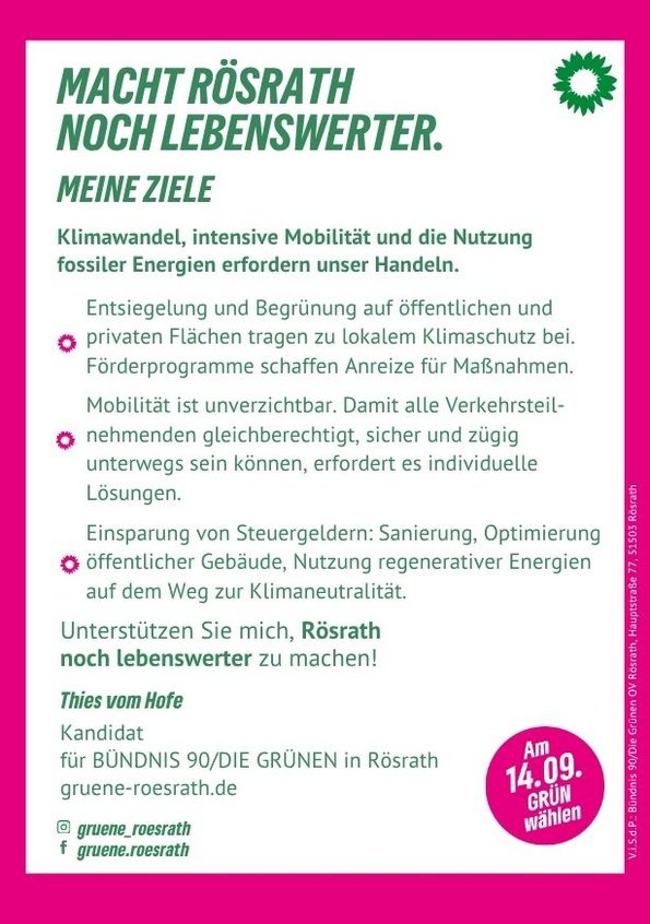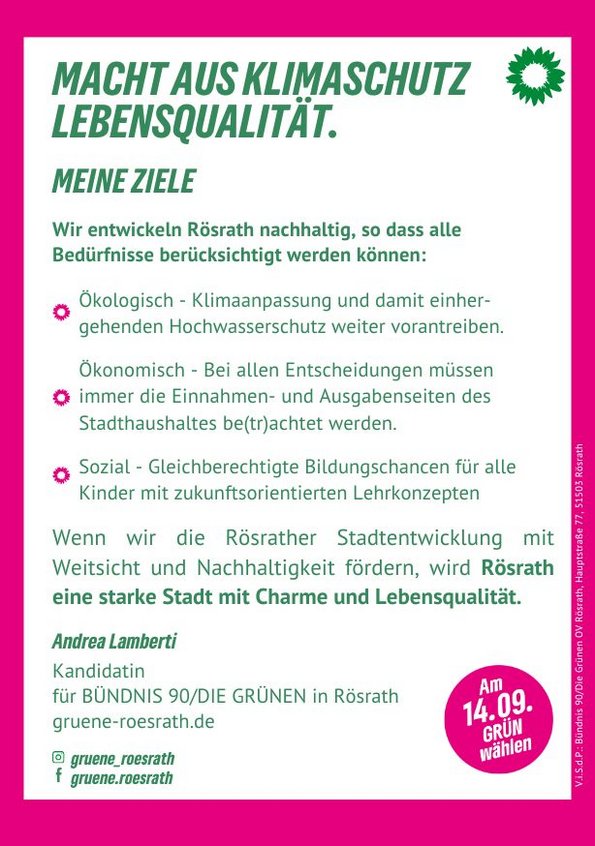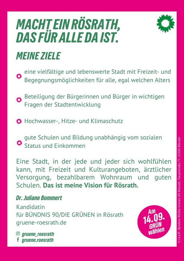 Mir ist wichtig, dass wir unsere Natur - den Königsforst, die Wahner Heide etc., , bewahren - als Raum für alle Generationen. Auch das Miteinander in Rösrath möchte ich bewahren - diese gelebte Nachbarschaftlichkeit macht unsere Stadt besonders. Und ich möchte das Engagement der vielen Menschen bewahren und stärken, die sich schon jetzt in Vereinen oder Initiativen wie Rösrath for Future, dem Bündnis für Demokratie, Kidical Mass, Rösrath Velo City oder der Flüchtlingshilfe einsetzen.