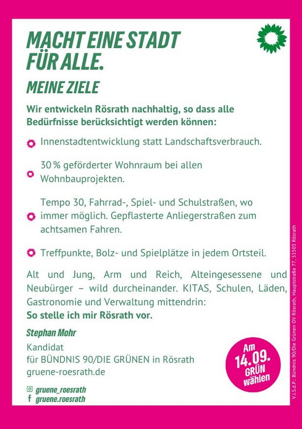 -Eine zukunftsfähige und transparente Stadtentwicklung, die sich mit allen Belangen der Rösrather Bürgerinnen und Bürger befasst, z.B. die Schaffung bezahlbaren Wohnraums. Dies unabhängig von der Frage, ob es sich um privaten oder öffentlichen Wohnbau handelt. Auch hierin enthalten sind alle bisher genannten Punkte und aus allem bisher Aufgeführten ergibt sich der wichtigste Punkt: