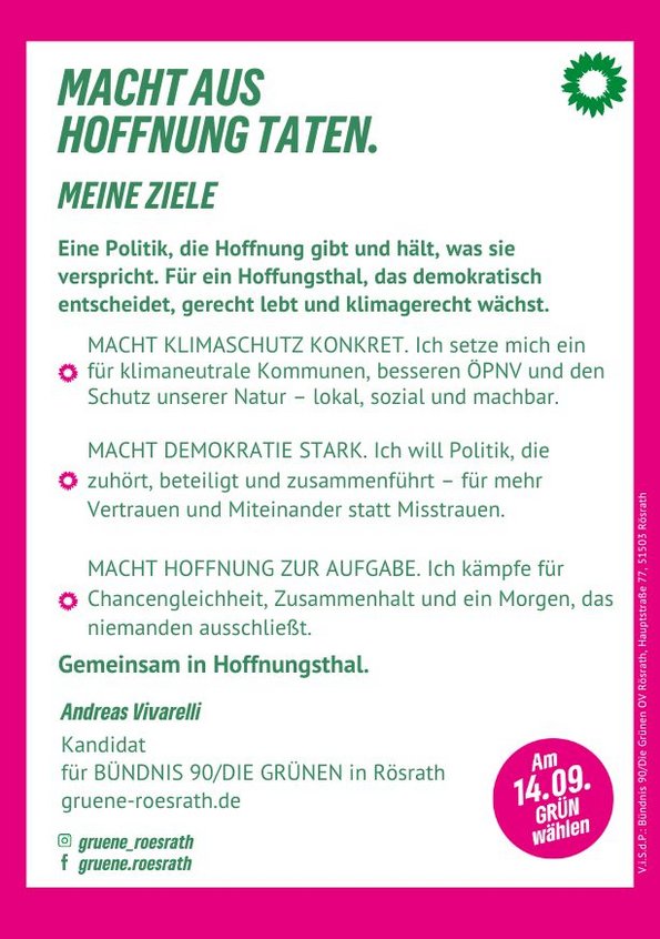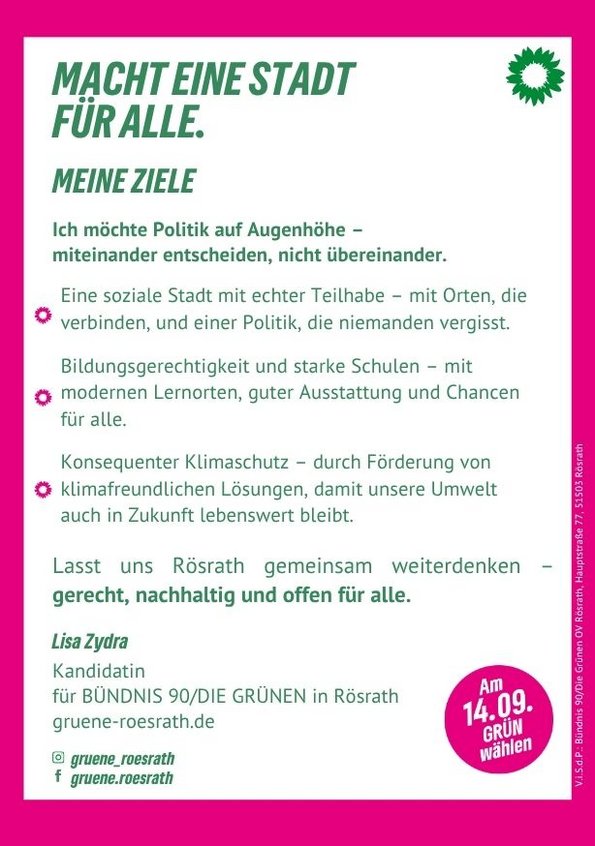 Ich möchte keine Politik für die Lautesten, sondern eine gerechte und inklusive Politik für alle. Mir ist wichtig, den Klimaschutz entschieden voranzutreiben und Nachhaltigkeit als Grundprinzip in allen Entscheidungen zu verankern. Ich möchte, dass die Kommunikation zwischen Politik und Bürger:innen transparenter und verständlicher wird. Unsere Schulen sollen besser ausgestattet werden und echte Bildungschancen für alle bieten. Außerdem möchte ich das Ehrenamt und unsere Vereine & Organisationen besser vernetzen und neue Orte der Begegnung schaffen, die den Zusammenhalt in Rösrath stärken.