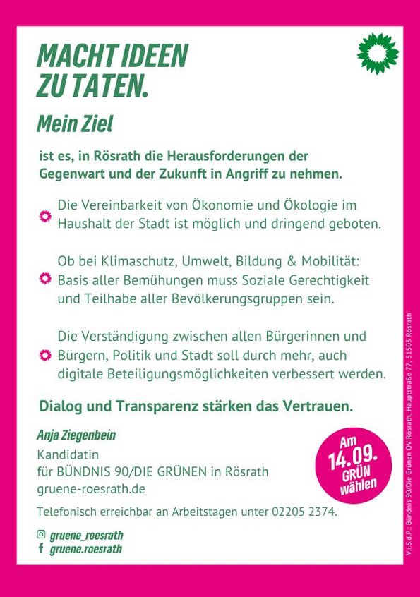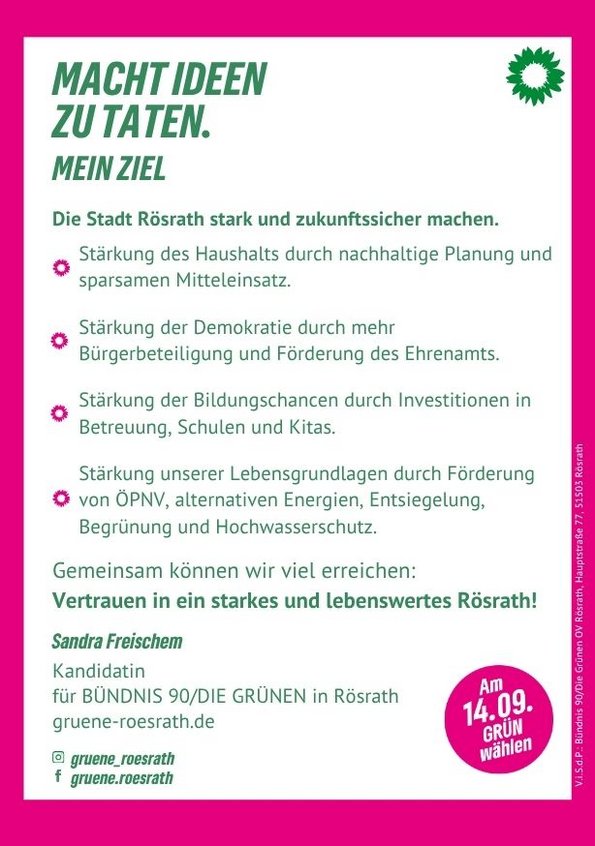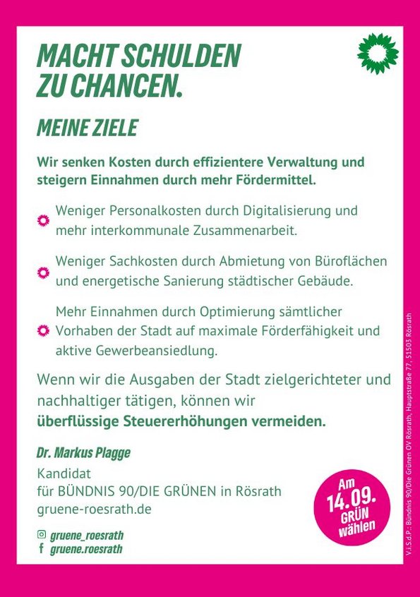 -Umstellung der Stadt Rösrath auf ein nachhaltiges Lebenskonzept für alle Bürgerinnen und Bürger. Alle zu treffenden Entscheidungen müssen nicht nur sozial und ökologisch betrachtet werden, sondern auch ökonomisch. Es gilt zu unterscheiden, was Kosten und was Investitionen ausmacht, es gilt, alle Belange der Bürgerinnen und Bürger in Betracht zu ziehen und es gilt, mit unseren Ressourcen schonend umzugehen. Egal, von welcher Ressource wir ausgehen: ob Umwelt