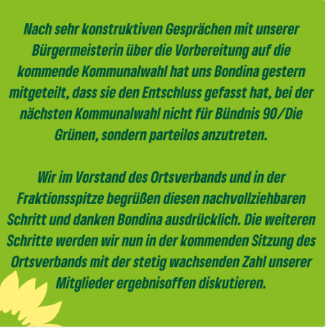 Nach sehr konstruktiven Gesprächen mit unserer Bürgermeisterin über die Vorbereitung auf die kommende Kommunalwahl hat uns Bondina gestern mitgeteilt, dass sie den Entschluss gefasst hat, bei der nächsten Kommunalwahl nicht für Bündnis 90/Die Grünen, sondern parteilos anzutreten.