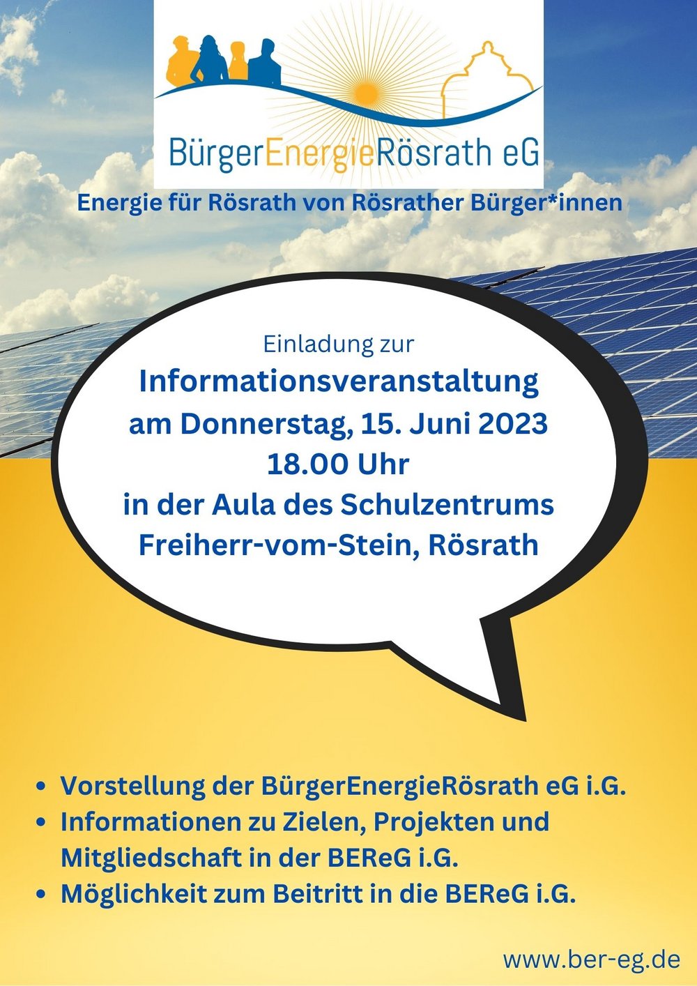 BürgerEnergieRösrath eG lädt alle interessierten Rösratherinnen und Rösrather herzlich ein zu einer Informationsveranstaltung rund um die neu gegründete Bürgerenergiegenossenschaft für Rösrath am Donnerstag, 15. Juni 2023, 18.00 Uhr in der Aula des Schulzentrums Freiherr-vom-Stein ein.