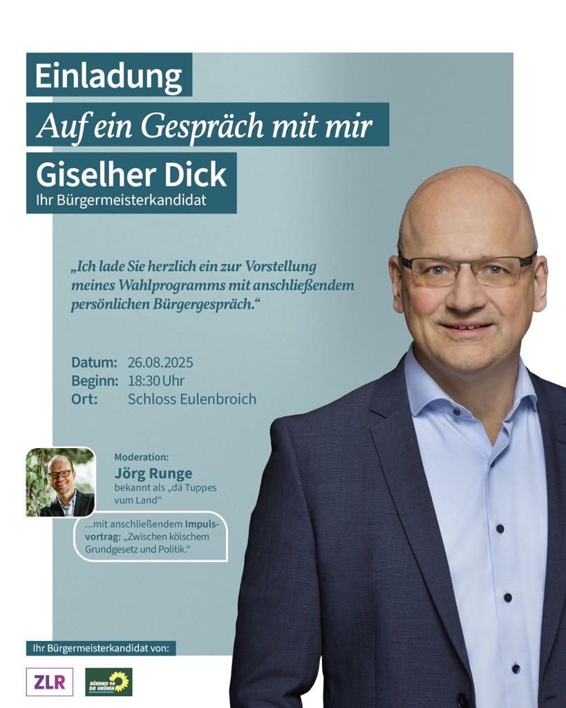 Unser Bürgermeisterkandidat Giselher Dick stellt an diesem Abend sein Wahlprogramm vor. Vor allem aber geht es um Ihre Anliegen: Was bewegt Sie, was wünschen Sie sich für die Zukunft unserer Stadt?