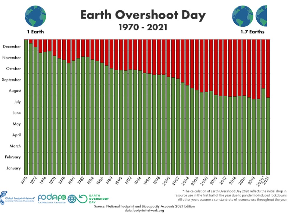 Reichte die Erde in 1970 noch nahezu aus (am 30.12. waren die Ressourcen verbraucht), wird diese Spanne seitdem von Jahr zu Jahr kürzer. In den letzten Jahren reichte die Erde nur noch bis Ende Juli.