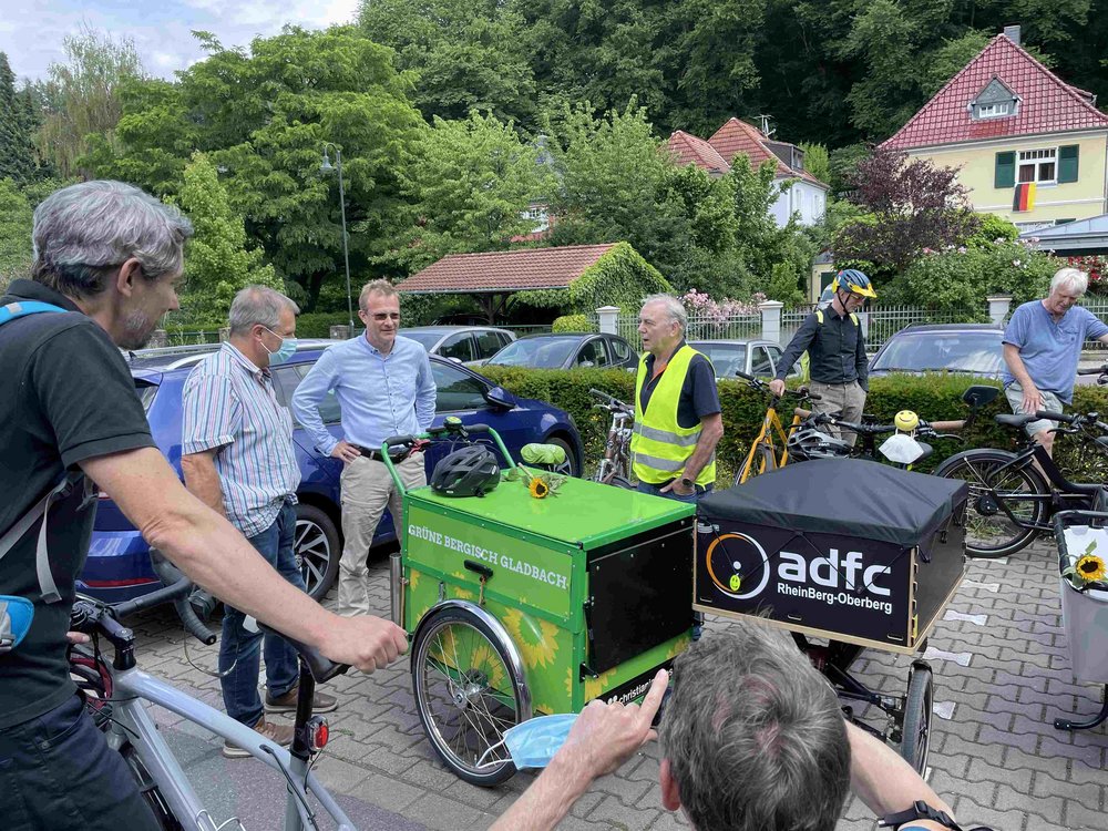 Unter diesem Motto stand die offene Radtour der Rösrather Grünen am 26.06.2021. Sie stellten Maik Aussendorf, ihrem Bundestagskandidaten, Highlights und Schwachstellen der Rösrather Fahrradinfrastruktur vor. ADFC-Aktivisten auf Kreisebene, aus Rösrath und aus Köln traten dabei ebenfalls in die Pedale. Maik Aussendorf, Radfahraktivist und Co-Fraktionsvorsitzender in Bergisch Gladbach, erwies sich dabei als sattelfest. Angereist mit einem knallgrünen Lasten-Bike berichtete er vom Bundesrat, der aktuell die Einrichtung von Fahrradstraßen erleichtern will. Die Rösrather hörten es mit Freude, bei diesem offiziellen Auftakt des Bundestagswahlkampfs - und bei strahlendem Sonnenschein. Durstig liefen die Tour-Teilnehmer anschließend beim Sommerfest der Rösrather Grünen ein, mit vielen neuen Ideen im Kopf und bald einem kühlen Getränk in der Hand.