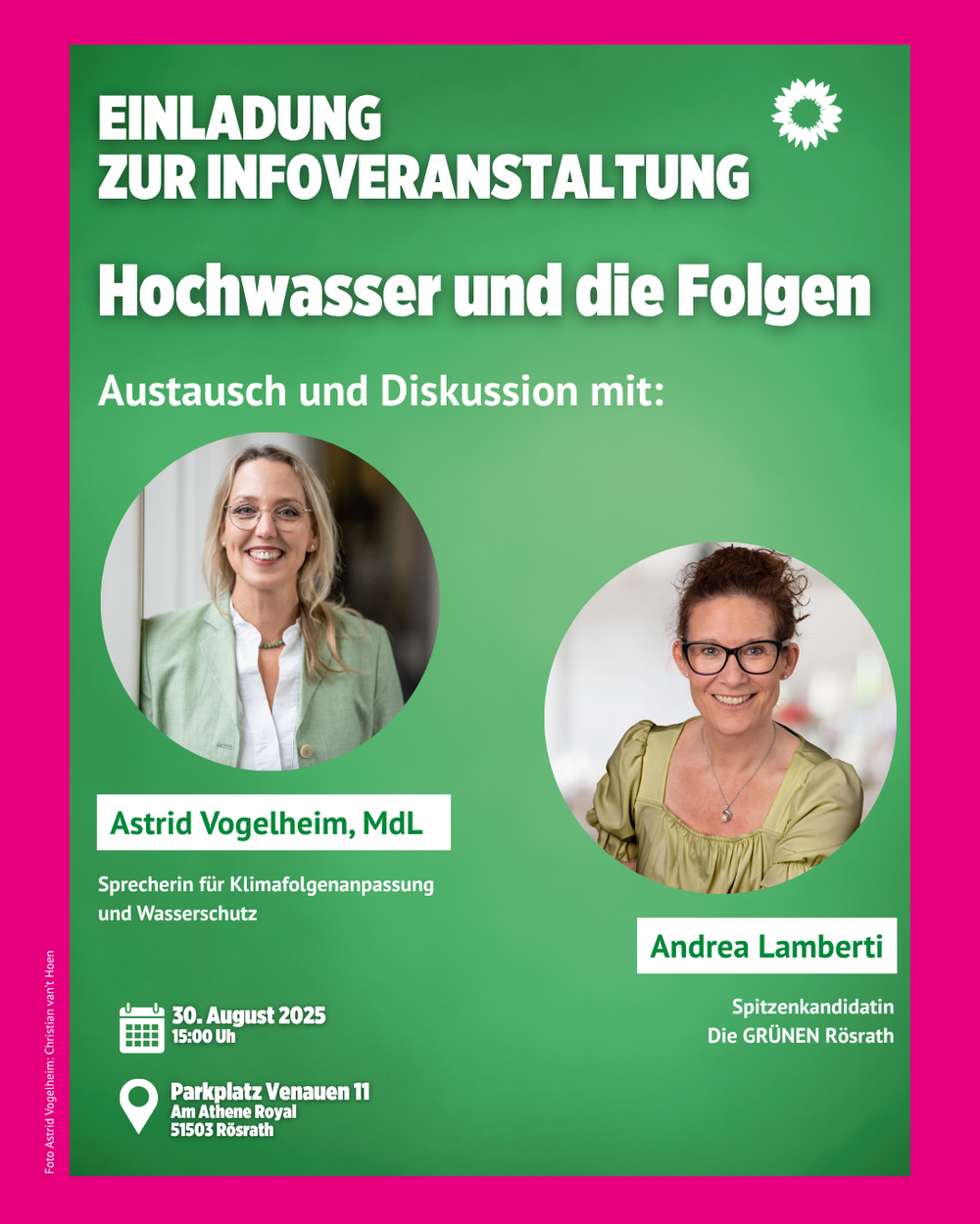 Am 30. August 2025 um 15:00 Uhr lädt der Ortsverband BÜNDNIS 90/DIE GRÜNEN zu einer Informationsveranstaltung zum Thema Hochwasserschutz mit Astrid Vogelheim (MdL) auf dem Parkplatz Venauen ein. Moderiert wird die Veranstaltung von Andrea Lamberti, Nachhaltigkeitsmanagerin und Kandidatin für den Stadtrat.